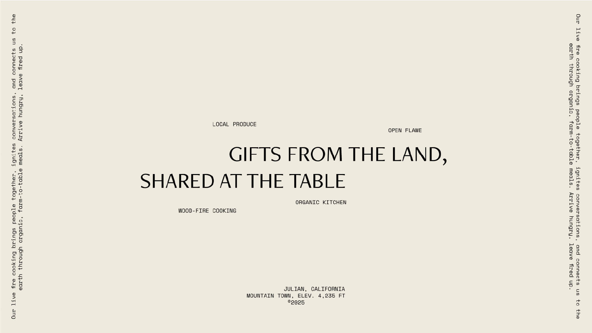 In Julian, California, live-fire cooking is a return to origin, where ingredients, technique, and landscape meet. Working with seasonal produce from local growers, the craft remains simple and intentional: pure, organic elements transformed over open flame into dishes with depth.The crackle of the fire evokes memory. It recalls the quiet rituals we all recognise: gathering, cooking, sharing.